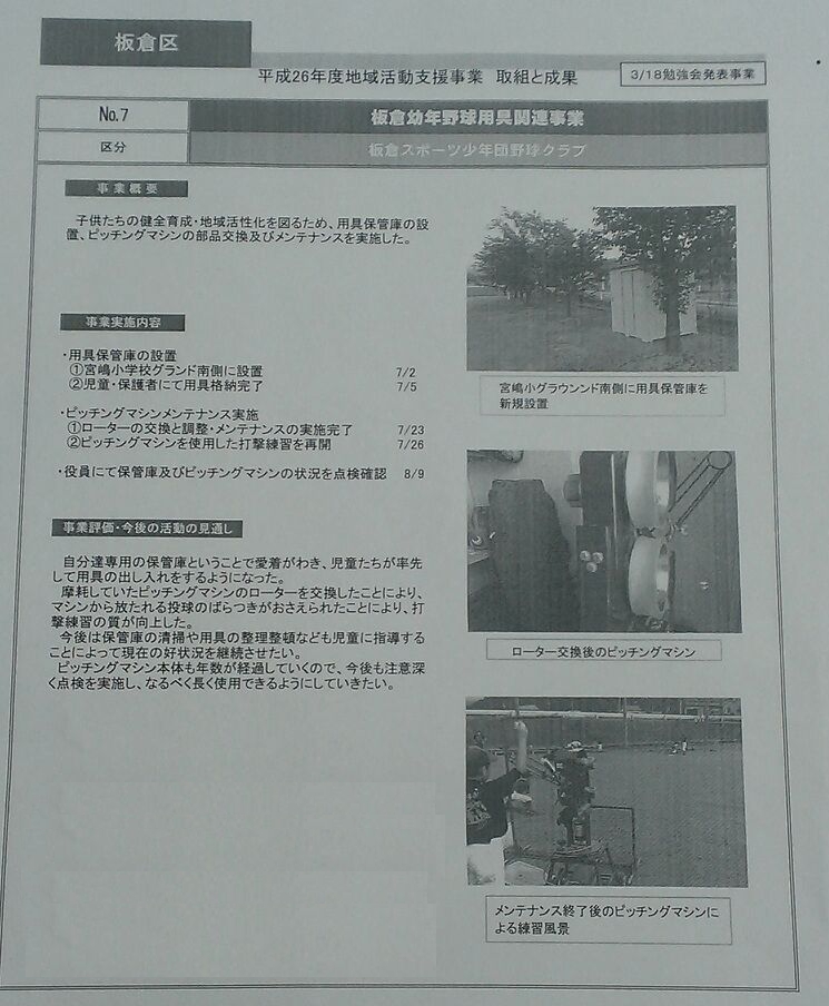 ピッチングマシンのメンテナンスに関する事業を報告。